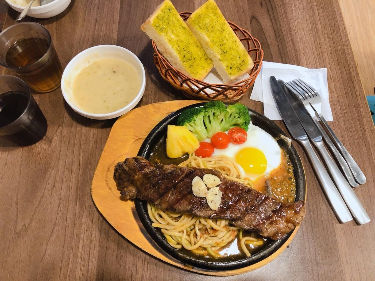 不同於紅寶石厚切牛排的長條狀,屬於一大片的牛片,味道老實說比紅寶石少了那點牛鮮味,但一樣是還可以的牛排(比夜市同價位的好吃),