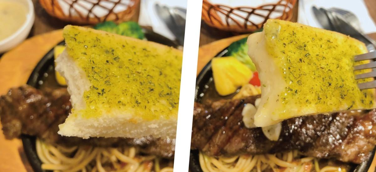 過一下下蒜香吐司上桌囉,那鬆軟的麵包體,上方塗抹蒜香醬,香鹹與吐司一起熱熱吃好吃耶~