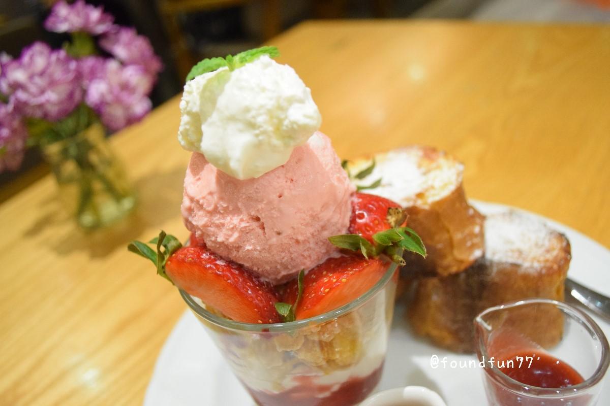 除了草莓淋醬與楓糖,他還有一杯聖代,