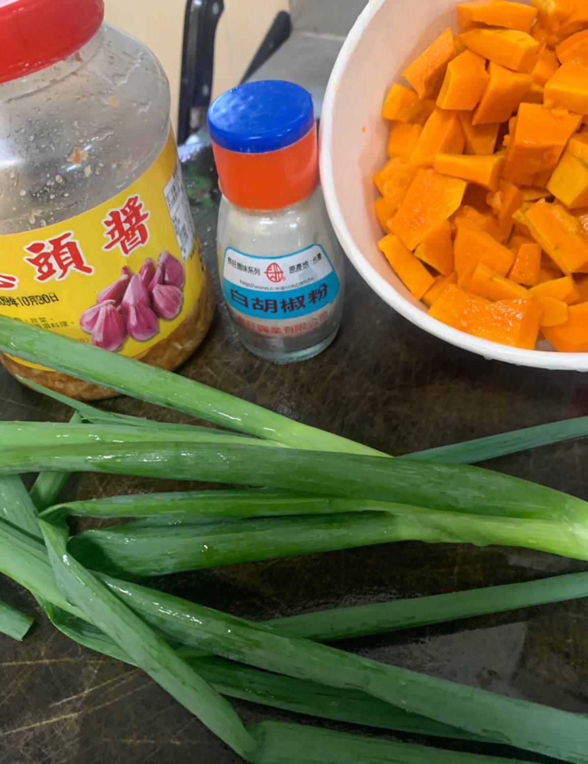 南瓜/半顆、新竹炊粉/兩包、蛋/一顆、蔥/兩支、蒜/兩辦