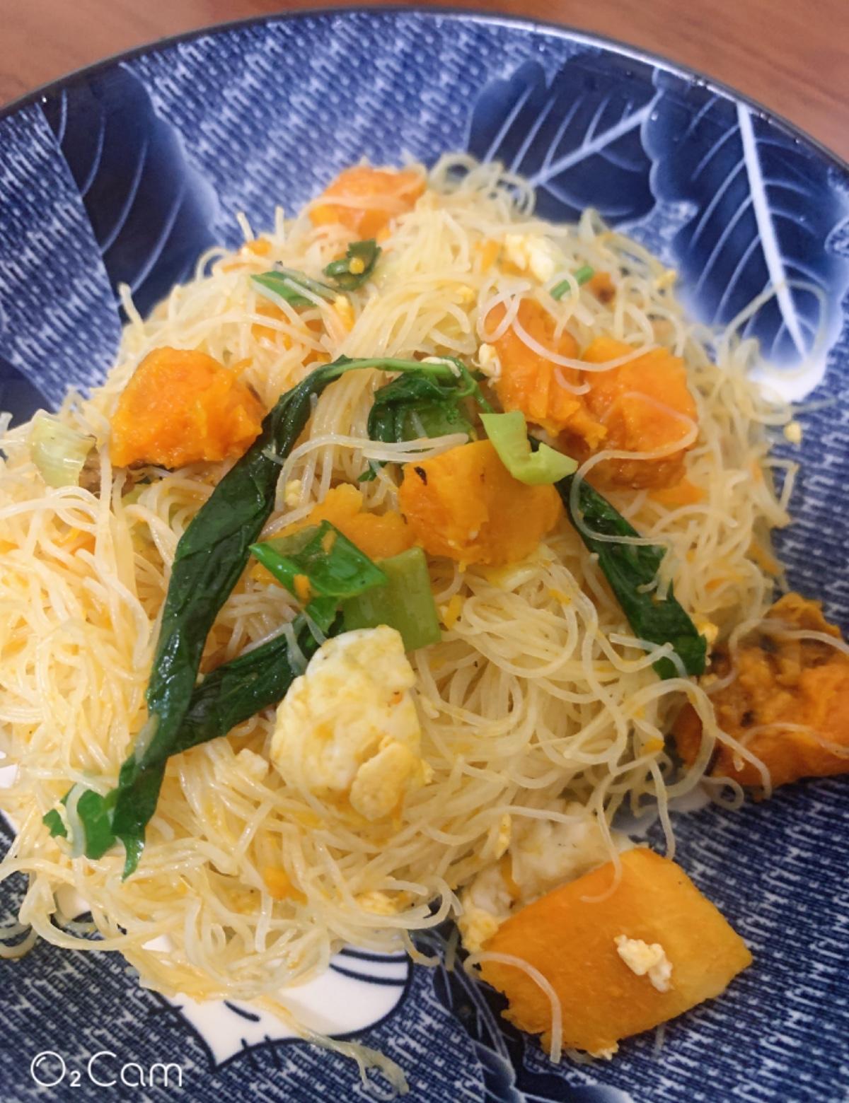 將南瓜洗淨去皮去籽、食材切洗備用,起鍋加入橄欖油,下一顆蛋翻炒幾回取出碗中備用,下蒜頭爆香放入切好南瓜炒至金黃色,在倒入備好的調味料直到南瓜變軟後,米粉和半碗的水一起下去、稍微的翻炒最後蓋上鍋子轉大火悶煮即可完成料理。