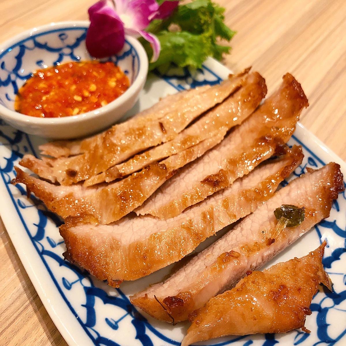 店家🏆招牌必點🏆,以天然香料醃製,烤出金黃酥香外皮,軟嫩的厚切松阪豬🥩沾上酸甜醬汁,絕配💯💯