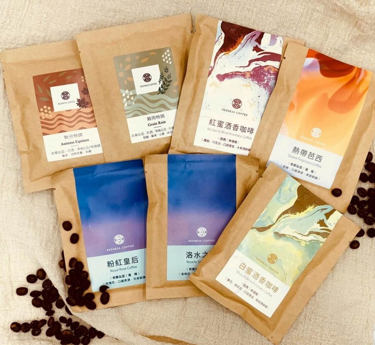 這次有機會品嘗到來自新竹的好咖啡:「紅鼎咖啡」(Redness Coffee)綜合精品濾掛咖啡組(含7種風味),價值約350元,其中有我愛的淺焙為洛神之水、粉紅皇后跟熱帶芭西這三包,跟我比較不喜歡的中深焙為秋分特調、穀雨特調、紅蜜酒香咖啡、白蜜酒香咖啡,外包裝是以藝術風格為主,每款咖啡的名稱都很寫意!