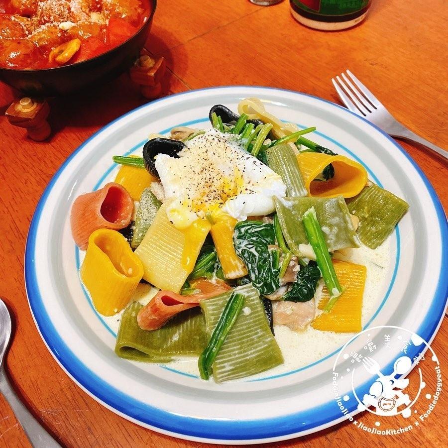 【自己煮美食】--- 嚼嚼菠菜蘑菇月見奶油雞肉筆管麵