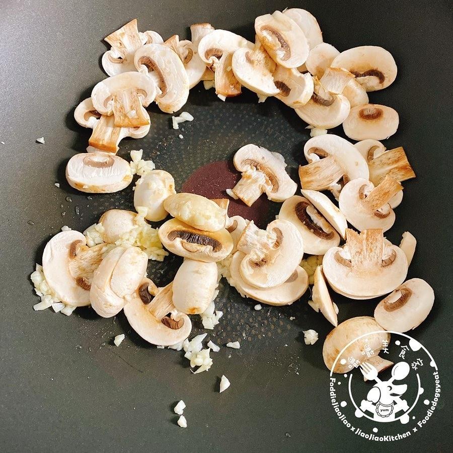②熱鍋放入奶油,融化後放入蒜頭爆香、再放入蘑菇炒到微微軟化