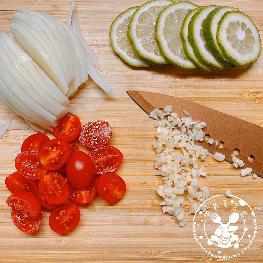 ①鮭魚先用白酒及鹽巴醃一下,同時檸檬切片、小番茄切半、洋蔥切絲、蒜頭切末