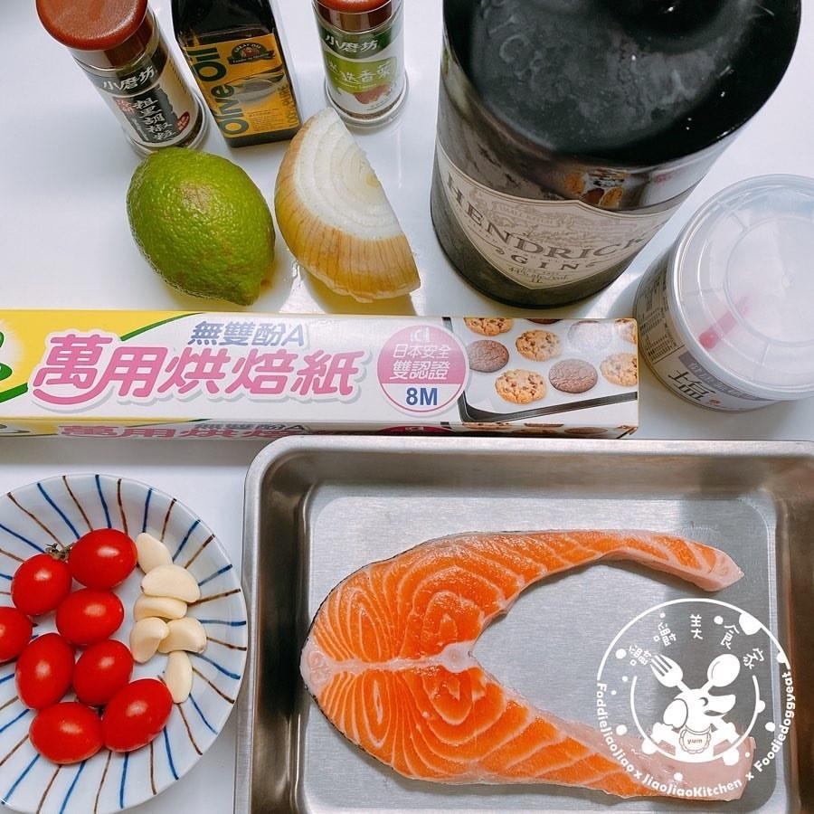 ②桌上鋪好烘焙紙,依序分佈擺放洋蔥、鮭魚、小番茄、蒜末、黑胡椒、檸檬片、義大利香料,最後淋上橄欖油