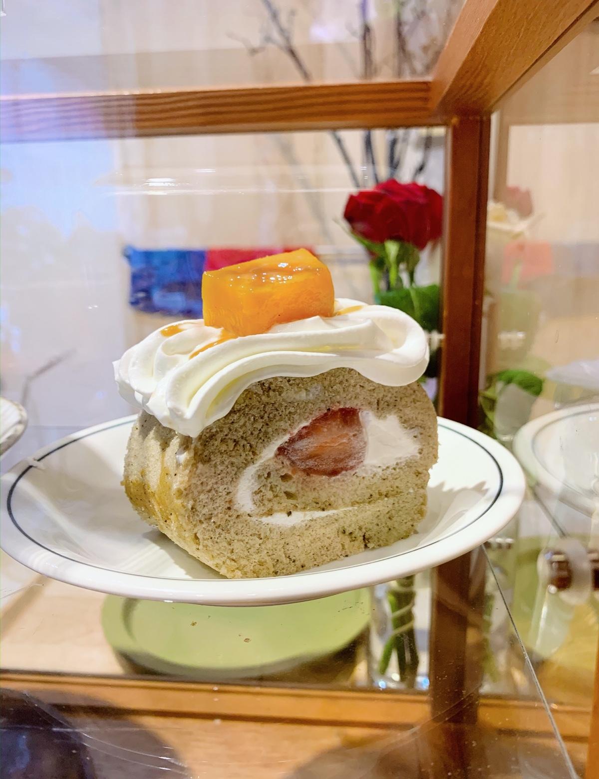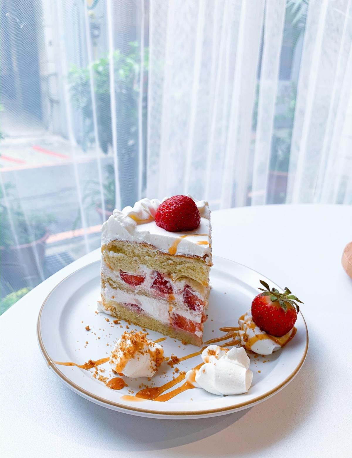 海綿蛋糕非常鬆軟,鮮奶油甜度不高口感卻很綿密,草莓新鮮不酸,再搭配上一點點的焦糖醬。