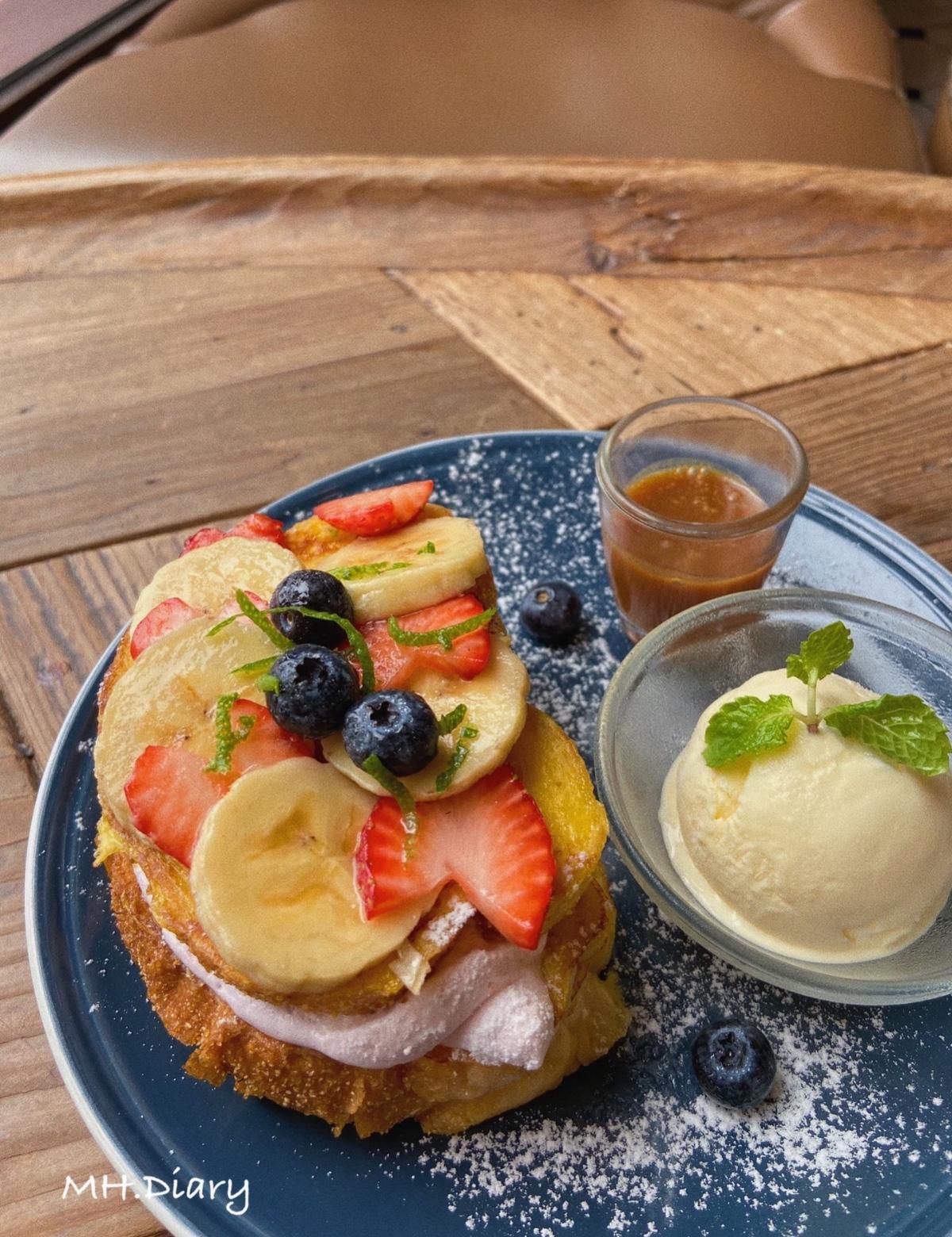 草莓與香蕉搭配著法式吐司,內裏還夾著軟綿綿的棉花糖,