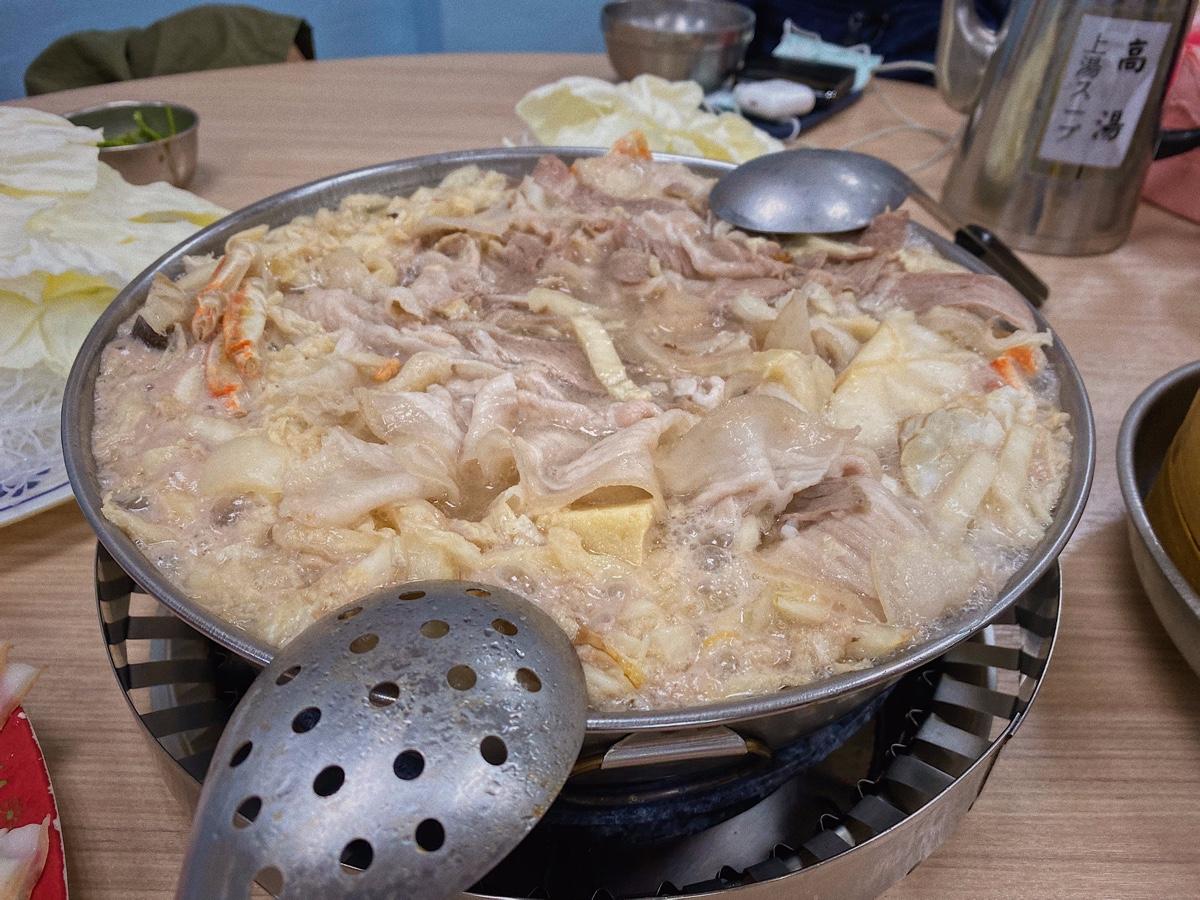 套鍋內容包含鍋底(酸白菜、白肉、凍豆腐、螃蟹、香菇、柴魚、蝦米等)