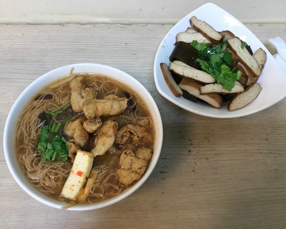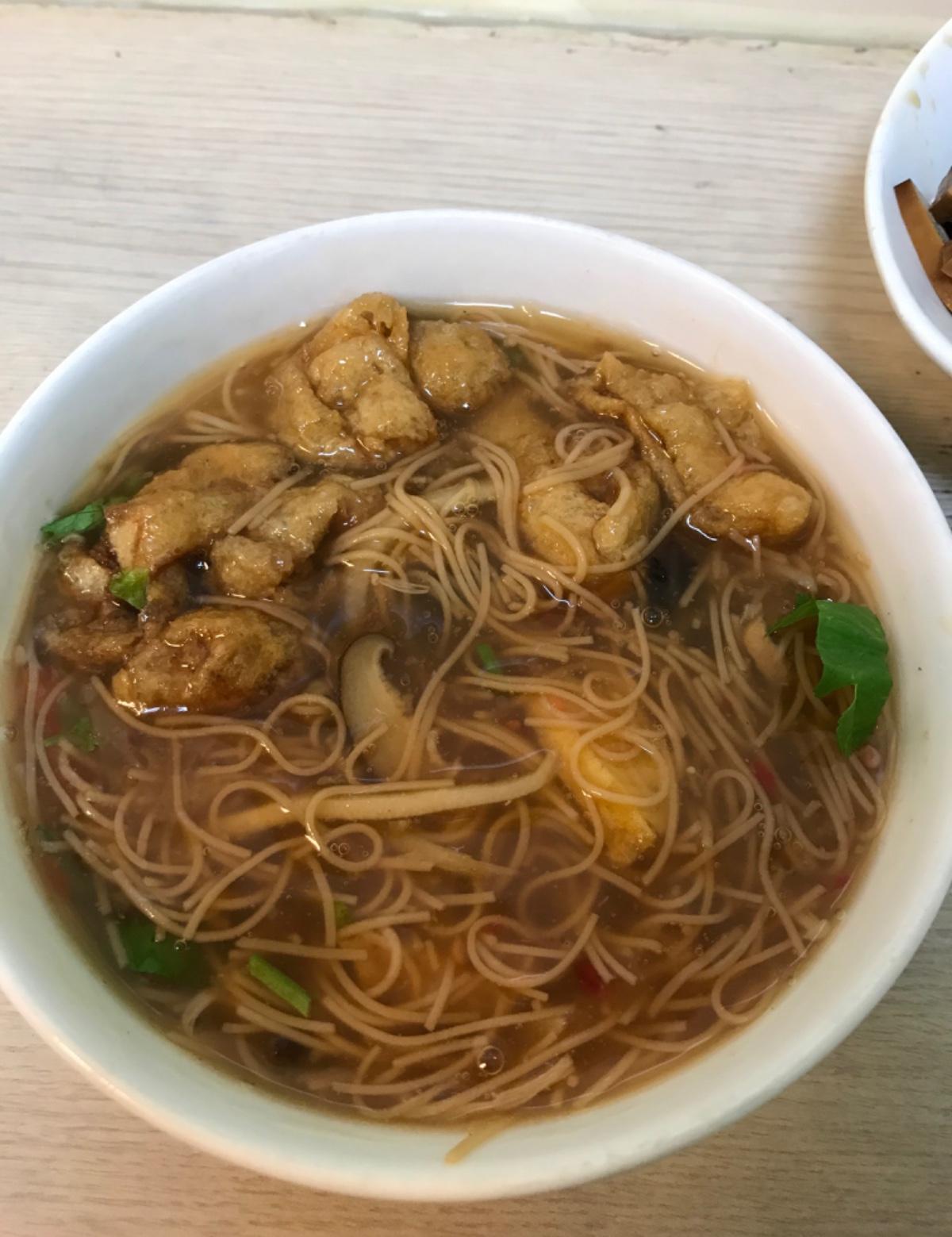 今天和大家分享北投在地素食美食"賢爸蔬食"。 我個人不喜歡有勾芡的食物,所以很少吃麵線,但它家的麵線完全沒有這問題,用料實在還附滿滿又脆的素酥在上面,讓我每個月都會去買。 小菜種類繁多,今天選了豆干和海帶都滷的很入味。而且CP值很高,小碗麵線+小菜才60元👍 #蛋素