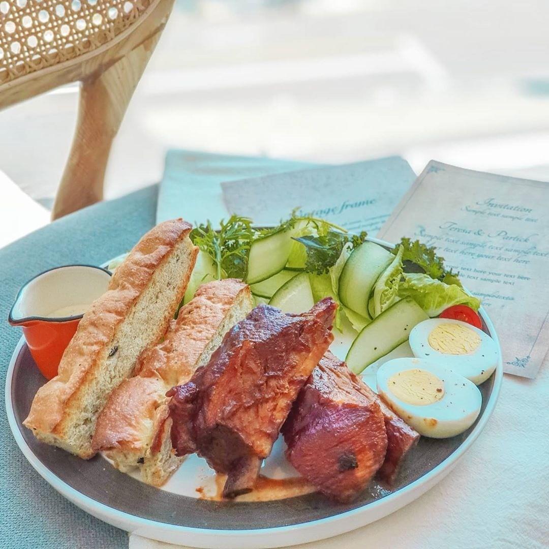 (蘿蔓鮮蔬沙拉,水煮蛋,煙燻豬肋排,佛卡夏麵包)