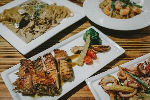 我們點了帕瑪森香橙奶香燉飯、起士奶油野菇義大利麵、炙透抽、南洋耶香咖哩雞腿肉(FB打卡活動贈送)、湯品主廚心情-番茄湯、蘋果汁,結帳一千一,沒有服務費。