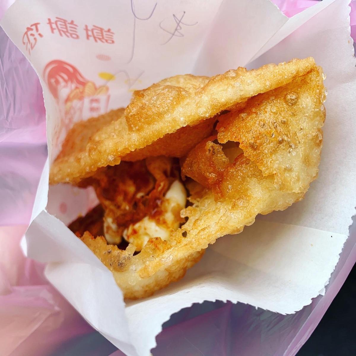 這間在茶街的轉角附近,不是常常能看見它的身影,但一看到無論多飽一定會買來吃!價格很便宜,也可以選擇蛋要全熟還是半熟,敢吃半熟蛋的朋友拜託你們一定要點半熟蛋啊😍 老闆霸氣的把整片蔥油餅放下去炸,再打入整顆蛋進油鍋,金黃酥脆的蔥油餅層次分明,蛋汁流洩而出跟醬汁結合變得非常濃香,絕對不輸花蓮的炸蛋蔥油餅!記得加點辣喔!