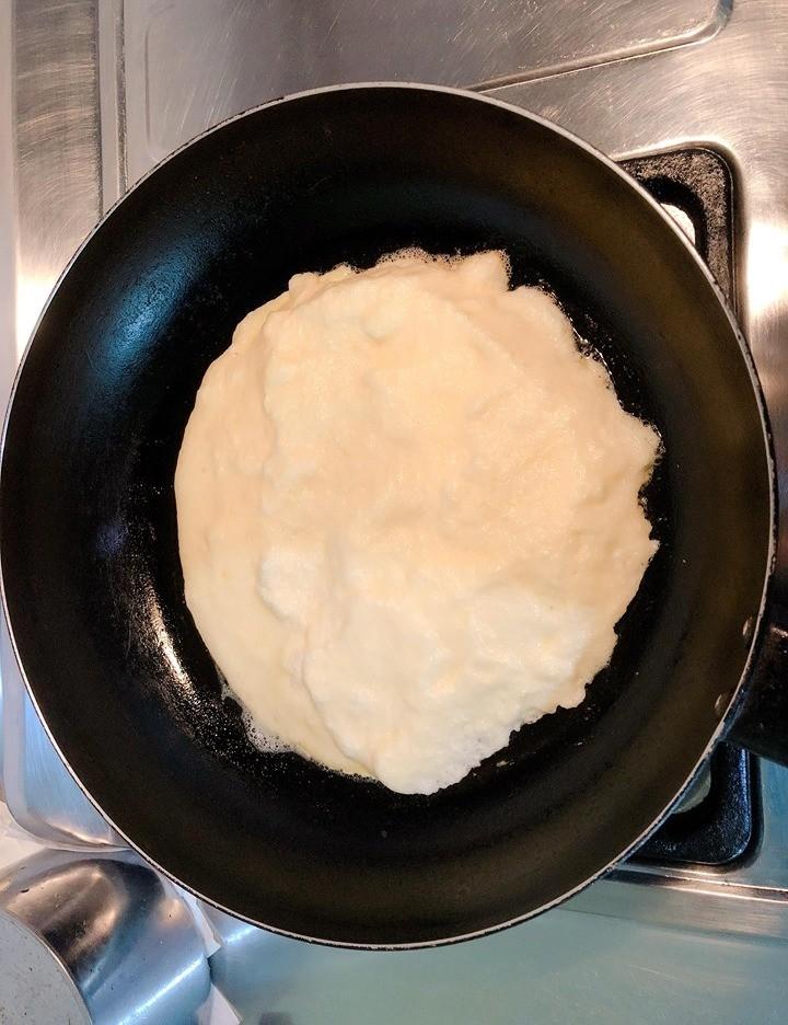 4.熱鍋小火加入奶油,倒入剛剛拌勻的蛋液,塑形成圓形並調整厚度,如果太厚會折不起來。
