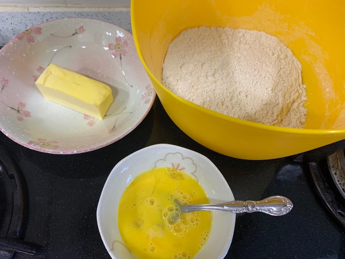 *從冰箱中取出無鹽牛油,切成小正方粒,將其塗加到麵粉中,混合後像麵包碎一樣