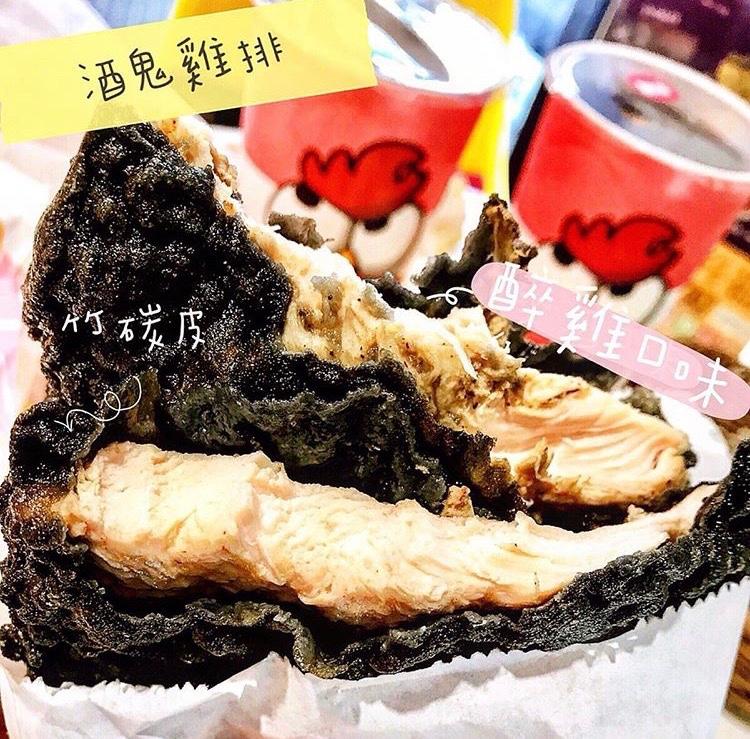 用天然薑黃粉下去製作的橙色外皮,灑上橘紅色的咖哩粉,一靠近鼻子就聞到濃濃的咖哩香料味,一口咬下肉汁溢出,很想大喊:老闆來碗飯!這是咖哩雞吧!!純正印度咖哩味!不只是皮哦,連肉都有醃進去咖哩味!👍 👉🍶+⚫️酒鬼雞排👈$70(竹碳皮)