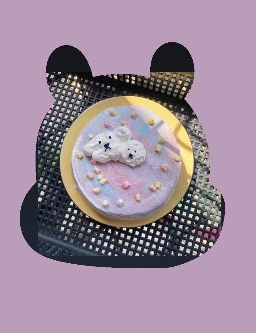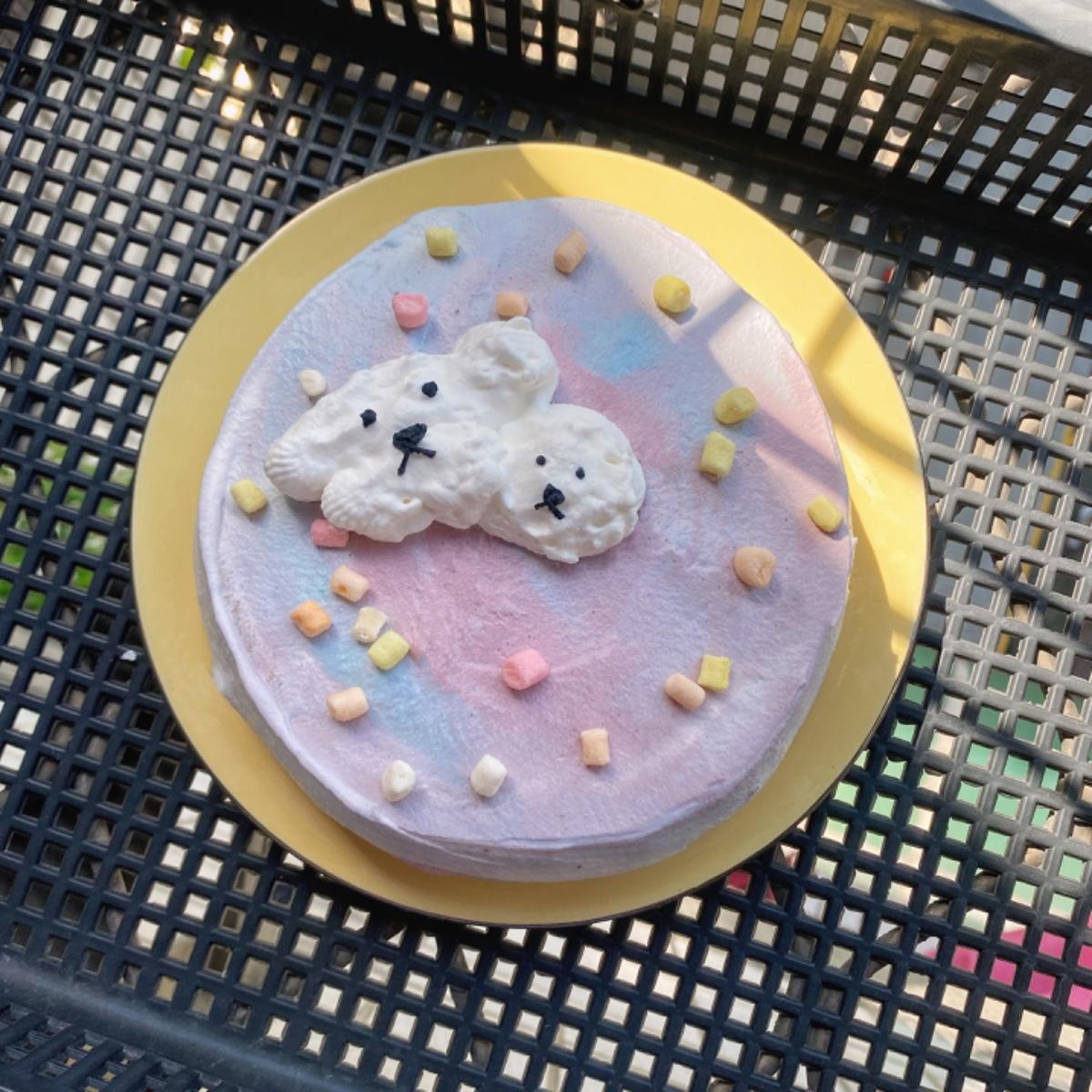 這次的成品有點不滿意哈哈哈 本來要做其他造型的 結果調色不滿意 七弄八弄就變成了暈染的蛋糕 然後今天天氣比較熱,奶油在我手中開始融化😂可怕😱 最後灑上棉花糖再擺上兩隻像棉花糖一樣的狗狗 就完成了
