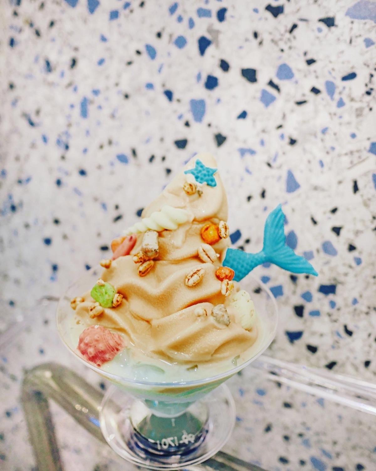 紅茶霜淇淋為基底,底部晶瑩剔透的海洋是香檳寒天,
