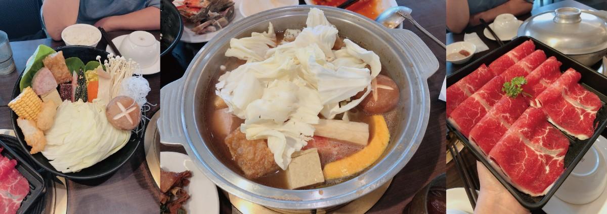 3吃:服務人員先將雞肉盛起來,加入高湯變成火鍋,在將多種蔬菜放進去煮,豐富的花雕雞火鍋就出爐囉,湯頭清甜卻富含花雕香氣,喝起來很順口,再將牛肉下鍋涮一樣很好吃~