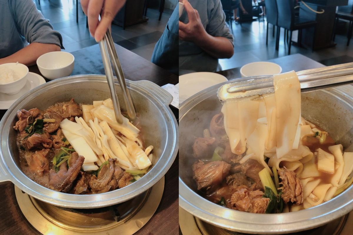 一開始先送上花雕雞鍋悶煮,服務人員來桌邊翻炒數次確定雞肉熟後,就幫我們把粄條放下去跟醬汁一起燉煮