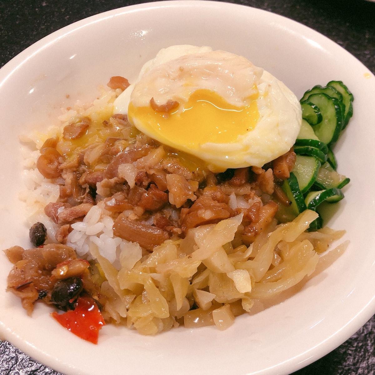 第一次來吃就點了蛋包滷肉飯,蛋包的蛋黃是生的,蛋液可以拌在滷肉飯裡一起吃,更提升香味😋 小黃瓜超脆超解膩,還有辣蘿蔔乾要多加幾匙!一碗這麼滿足只要60元,在台北市CP值已破錶👍