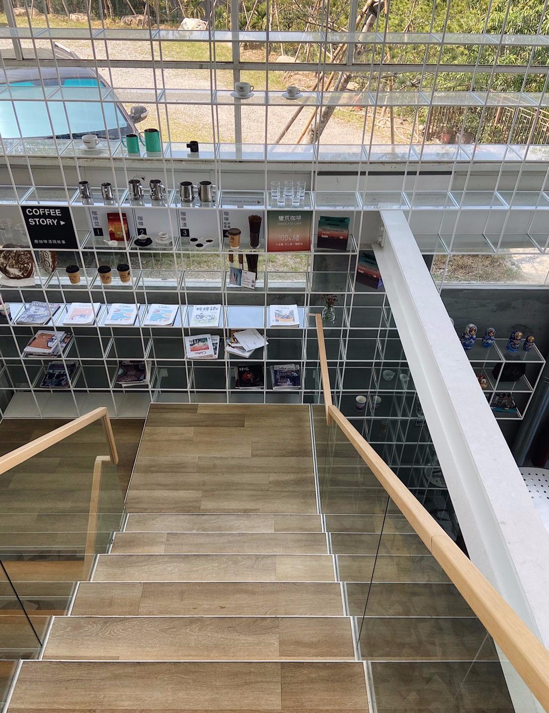 「蠻荒咖啡 Desolate Coffee」最有名的打卡景點大概就是這一景了!偌大的玻璃簍空樓梯,透過零星擺設的書籍望出去,是一大片的綠油油的樹林。用餐之餘,不妨在這裡拍張 Instagram 美照,保證詢問度破表(認真,我發這張限時已經被問到不行)