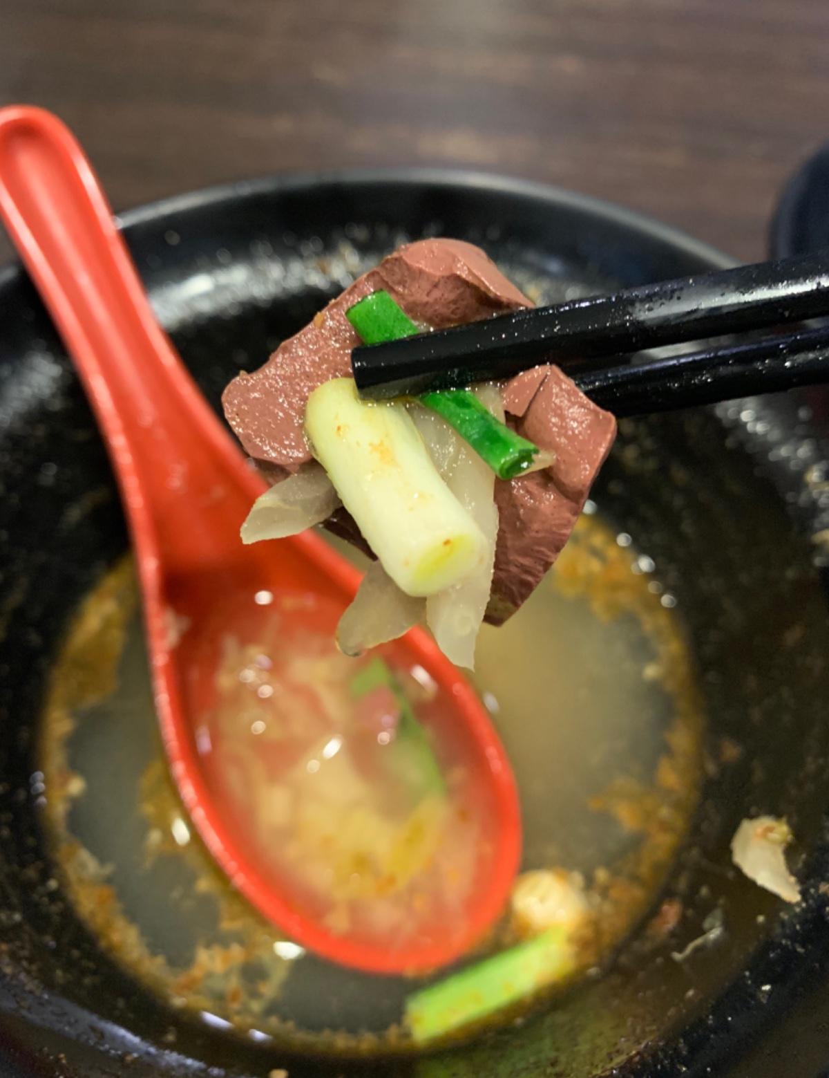 好加在同場加映的豬血湯、滷肉飯沒有那麼讓人心碎,口味偏甜的滷肉飯,滷汁的肉末很豪邁,有條狀有塊狀,個人偏好讓每一粒米都被滷汁包裹住,因此我都會充分攪拌均勻,再慢慢一口一口吃;豬血湯的豬血跟湯感情非常不好,味道是各自獨立,豬血本身完全沒有味道,湯頭很濃郁,所以我把豬血搭著酸菜韭菜一起吃,如果你喜歡原汁原味的豬血,這家的豬血湯你絕對會很喜歡!