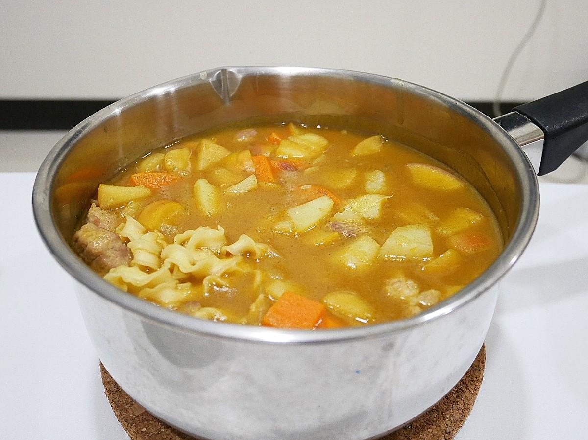 把麵條以前的食材直接省略,麵煮完之後熄火就可以放入咖哩塊拌勻,美味直接開動
