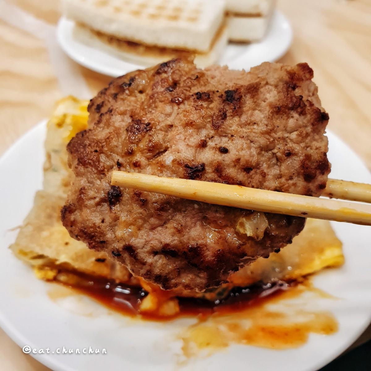 古早味的粉漿蛋餅,加肉跟蛋似乎是他們的經典組合,看到很多人都這樣點🤣。蛋餅皮用粉漿製成,比較濕軟,介於蘿蔔糕跟蚵仔煎之間的口感,跟一般的不太一樣,但很合我的胃口,喜歡酥脆蛋餅的朋友可能就不太適合囉~ 再搭配蛋黃流出的半熟蛋還有手打胛心肉排,這樣一份就超級飽足了!⠀