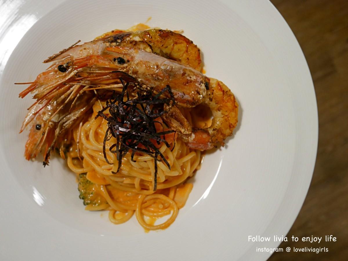 明太子奶油義大利麵中有大大的天使紅蝦,而且已經幫我們撥好蝦殼,