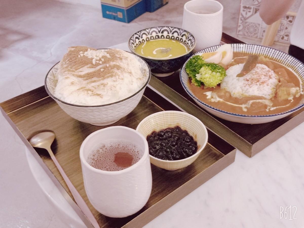 我來吃冰,珍珠鮮奶雪花冰100,我朋友點咖哩飯220,還不錯,小文青的店,都有附一杯熱茶,真特別,我吃冰送我熱茶