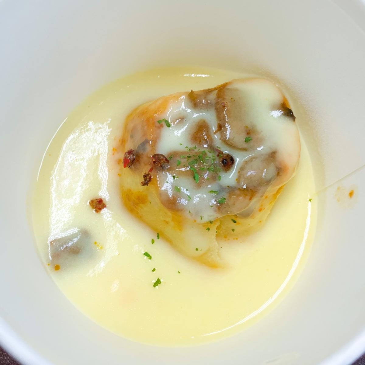 ▫️麵包:一份主餐是附上一顆圓形的烤麵包~(照片中有兩顆是因為他幫我們裝一起了~)是類似很健康的蔓越梅雜糧健康麵包的口味~有附上奶油可以塗上搭配~但畢竟是外帶~無法享受到現烤熱騰騰的感覺~有點冷掉~口感偏中硬~😢