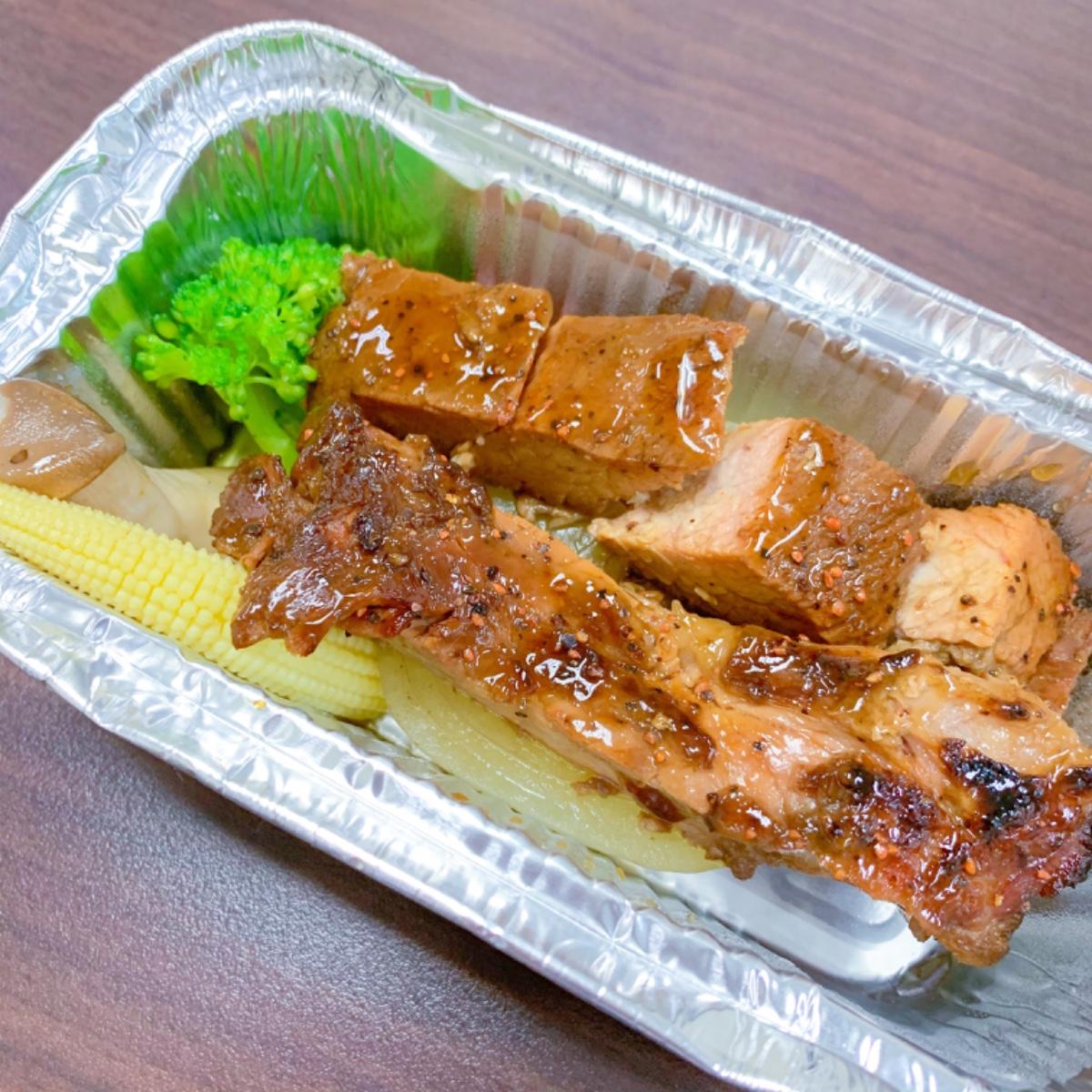▫️炙燒豬排:真的好嫩好好吃😋有一根充滿肉的肋骨、四塊厚實無骨的豬排,底下鋪上洋蔥,有花椰菜、玉米筍、杏鮑菇~肉真的好好吃~~~而且餐盒底下還黏有暖暖包~所以外帶後吃的溫度還是溫溫的!👍也有附上沾醬~但是不沾就很好吃了😝