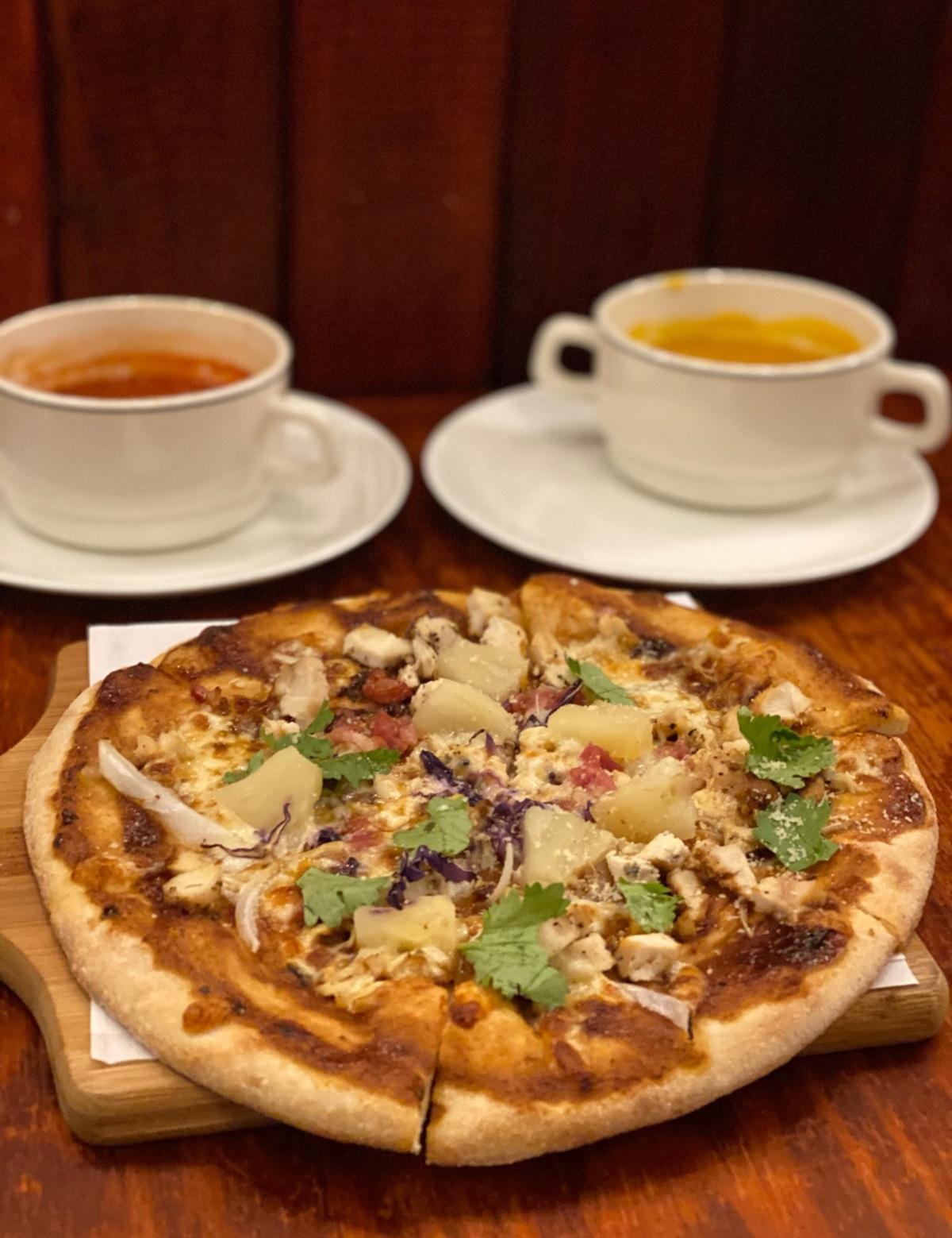 內容物:雞肉、洋蔥、鳳梨、培根、香菜、紫甘藍、馬芝瑞拉起司、帕瑪森起司