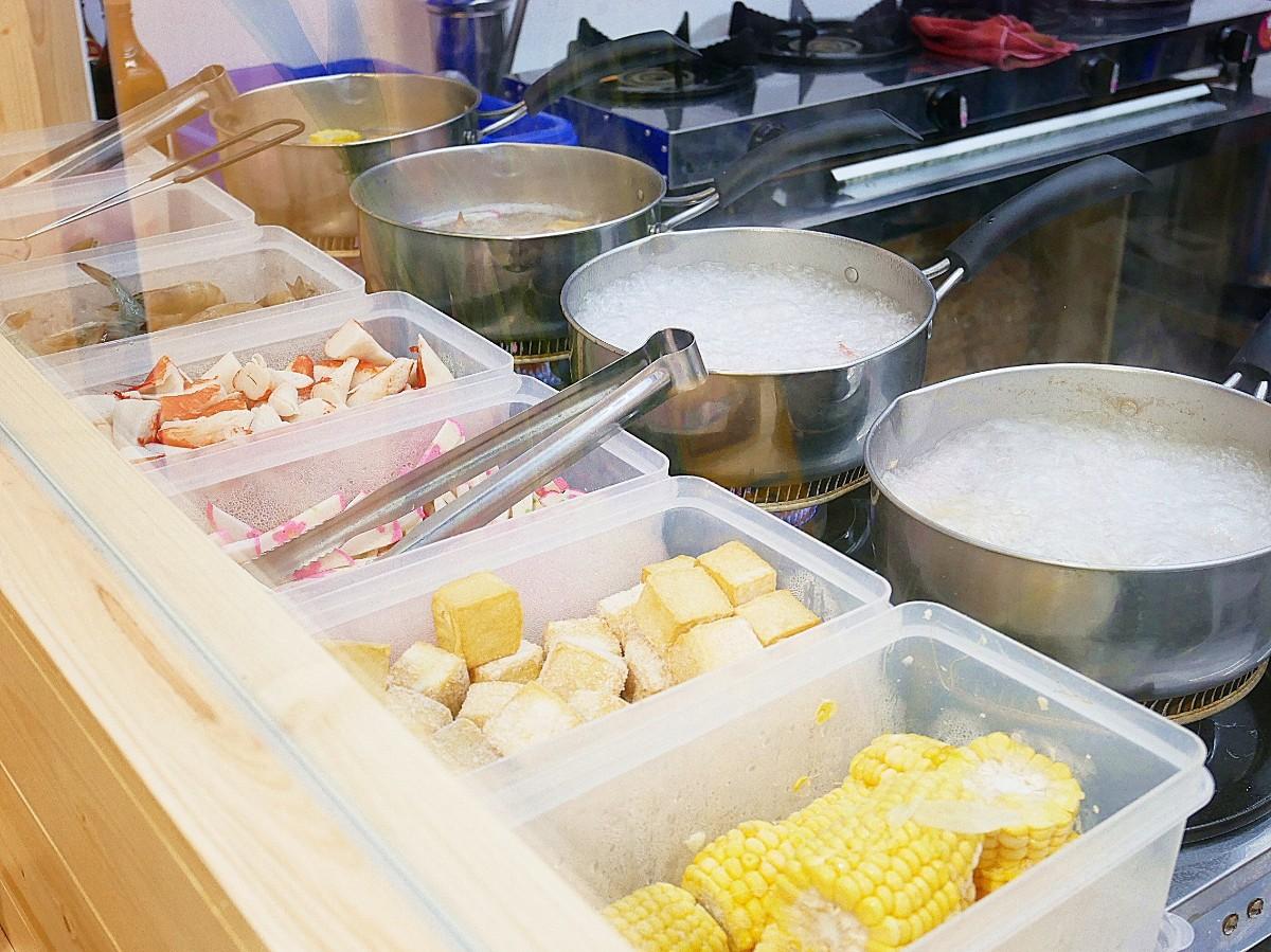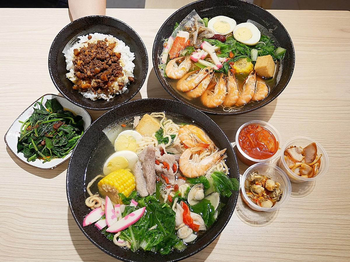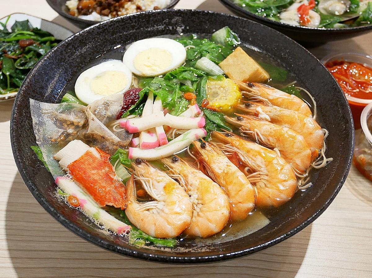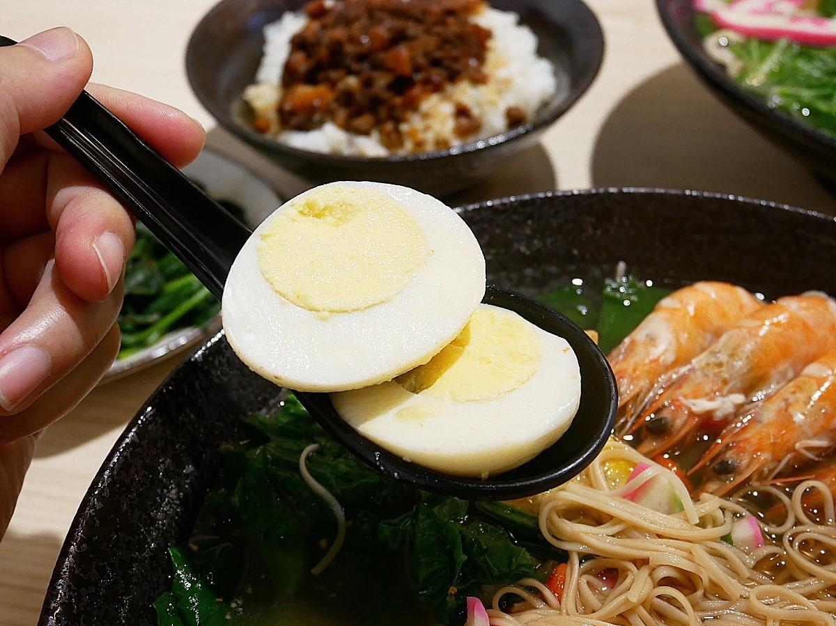 除了蝦子之外還有蛤蜊、魚板、玉米、蔬菜以及一顆水煮蛋,用料滿豐富