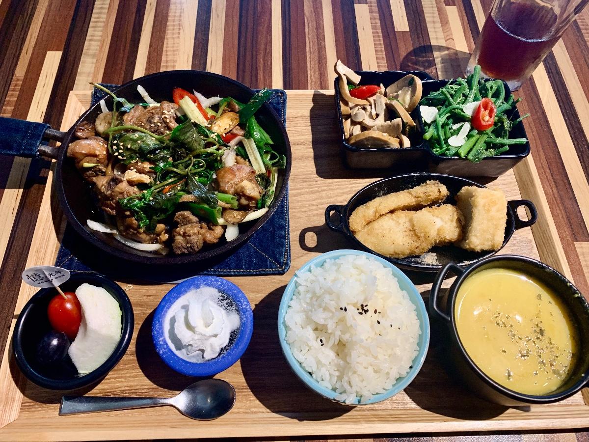 三杯雞本身微辣,大概一顆星的辣度(本人吃麻辣鍋都吃中辣)雞肉帶一點點嚼勁(是隻愛運動的雞),肉本身很入味醬料跟九層塔的味道有被炒進去,我覺得白飯有點微硬,但是我平時最喜歡吃軟爛的飯所以可能對其他人這個飯就是正常軟硬度,我把飯加進平底鍋浸在醬汁裡整個就Do Re Mi So一級棒