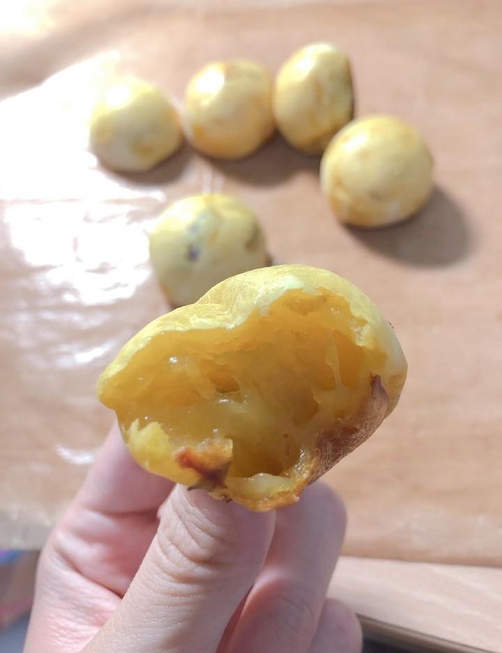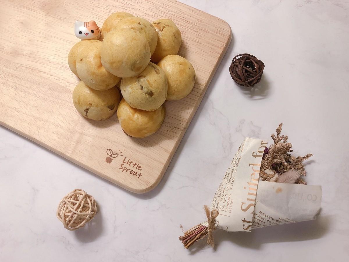 3.在加入地瓜粉拌勻到沒有麵粉顆粒,若拌勻後還是覺得很濕黏在碗邊邊可以再加一點粉。 4.拌勻後20克為一顆搓圓,放在烤盤上,要空一點距離因為等下會膨脹一點點。