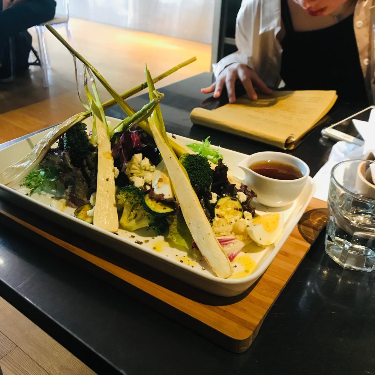朋友B點了單純的自選沙拉盤,搭配的是油醋醬。這筍的擺法,真是看上去非常後現代藝術風格阿哈哈哈哈哈