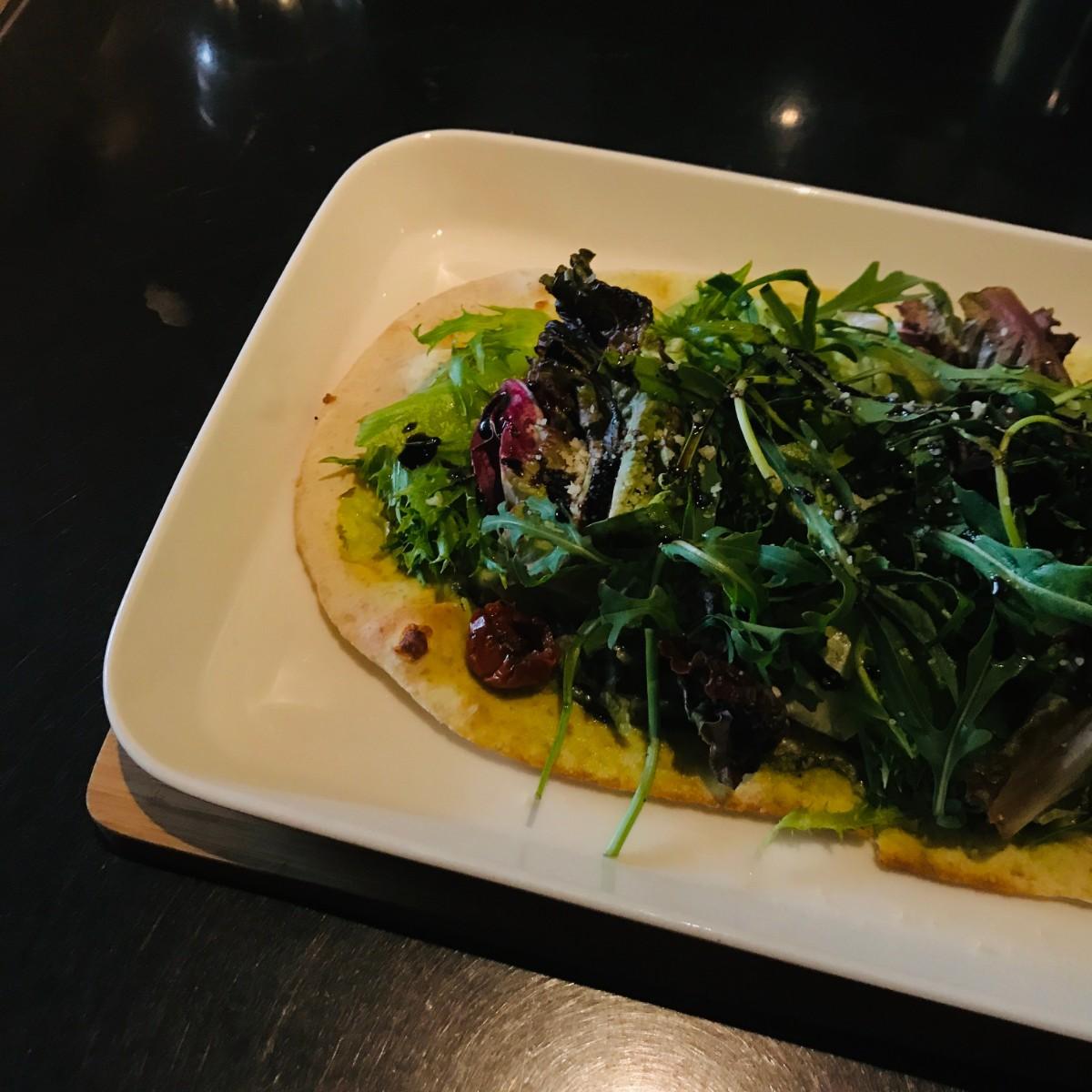 我自己點的是小分200元的「芝麻葉沙拉烤餅」,這道完全深得我意。芝麻葉、風乾小番茄、莫札瑞拉起司、蘿勒醬,加上特調的微甜醬汁,不只完美蓋住了生菜味,搭配底下烤的又脆又軟Q的烤餅捲起來吃,根本就是在吃薄片披薩,而且是「一人份的健康披薩」,鹹甜鹹甜的滿足了想減肥又超愛吃披薩的我啊!這家的薄餅總共三種口味,各有大小份之分,是絕對必點的一道!!