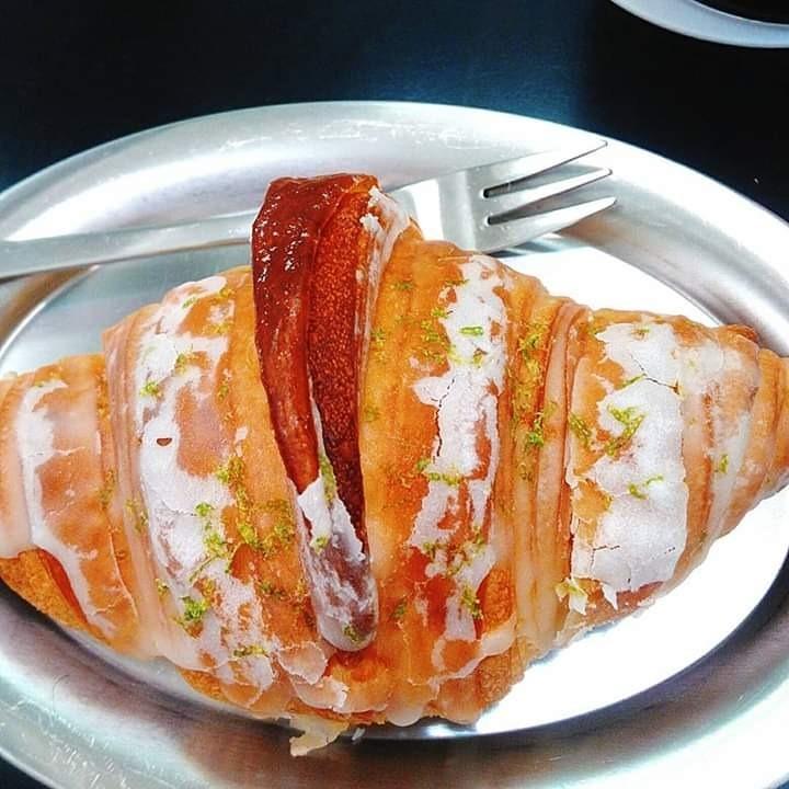 檸檬可頌,麵包柔軟很有彈性,一層一層堆疊很有嚼勁,檸檬酸酸甜甜,香氣十足。