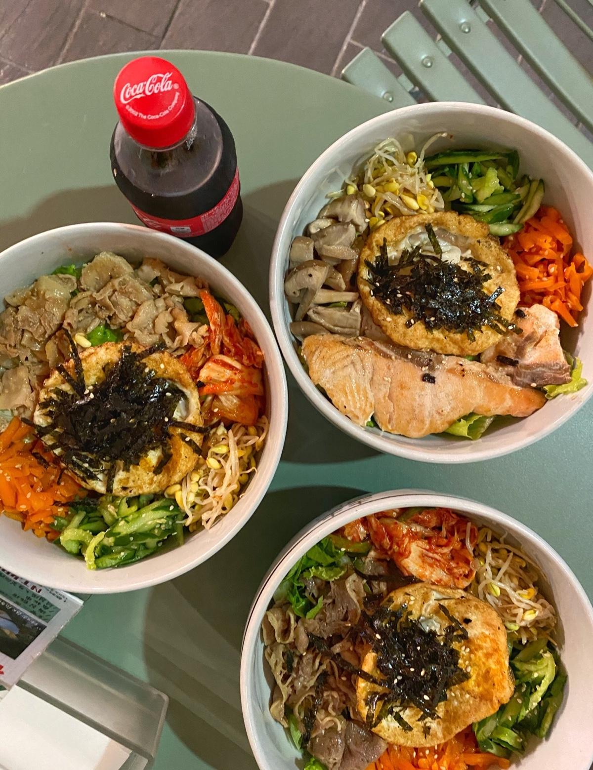 五顏六色的蔬菜,清爽的醬汁,多汁的鮭魚(很大塊),一顆太陽荷包蛋,一上桌就可以享受翻飯的樂趣,夏天吃碗清爽的拌飯,很舒服