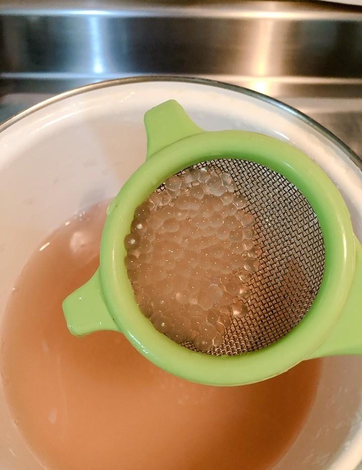 1.煮一鍋水,要比西谷米的量多很多,待水滾後一邊攪拌一邊倒入西谷米避免黏鍋,持續煮約10分鐘後關火,再悶15分鐘左右。