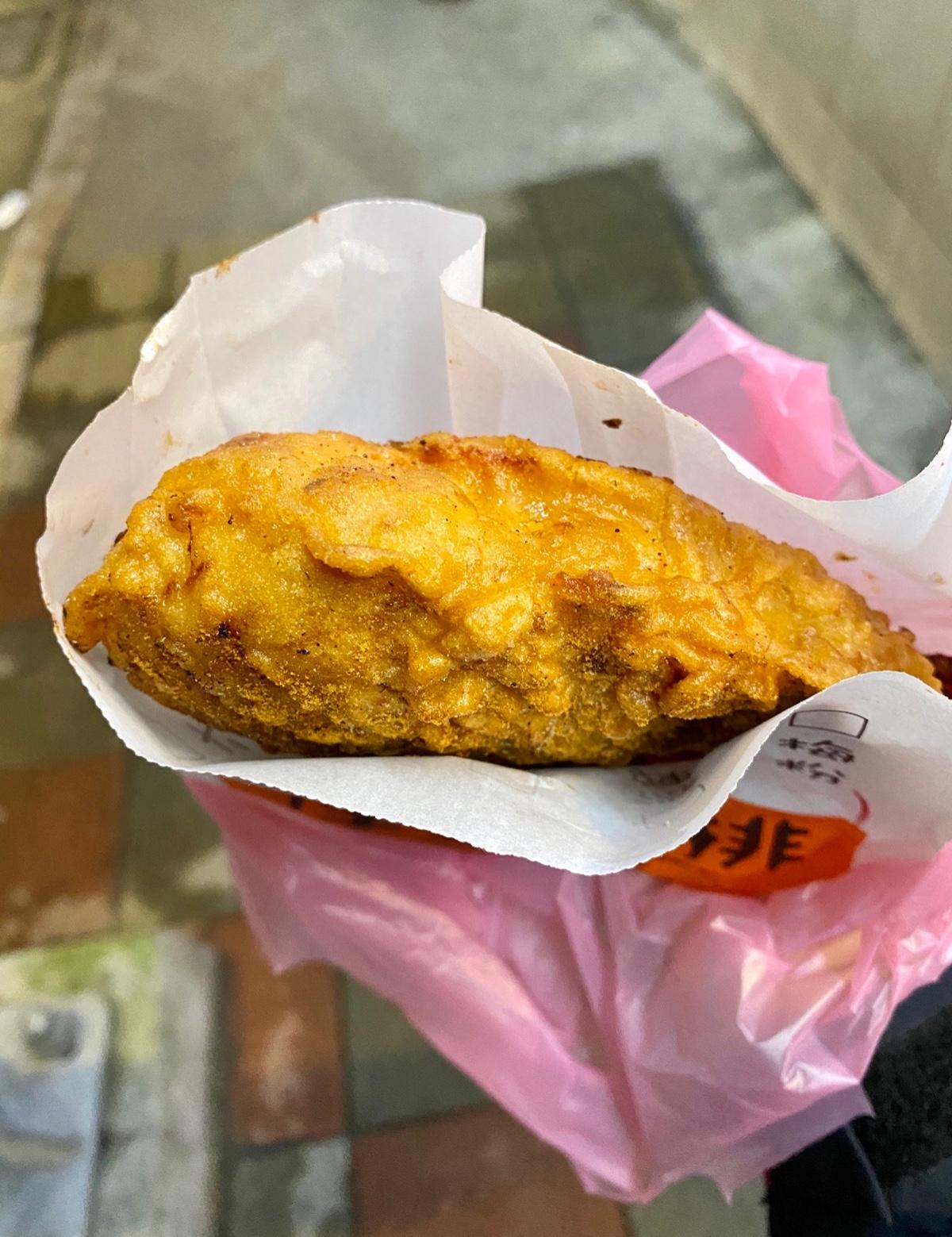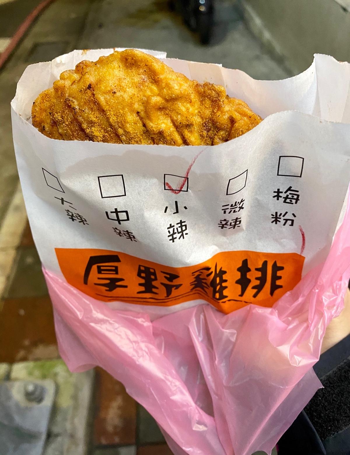 個人覺得雞排是標準size,不過肉真的蠻厚實,趁熱吃,每一口咬下去,鎖在裡頭的肉汁立馬爆汁出來,肉質非常鮮嫩多汁,薄脆外皮酥脆口感,麵衣感覺微微帶甜味,搭配小辣&胡椒粉,個人覺得非常好吃👍🏻。超級推薦的❤️。