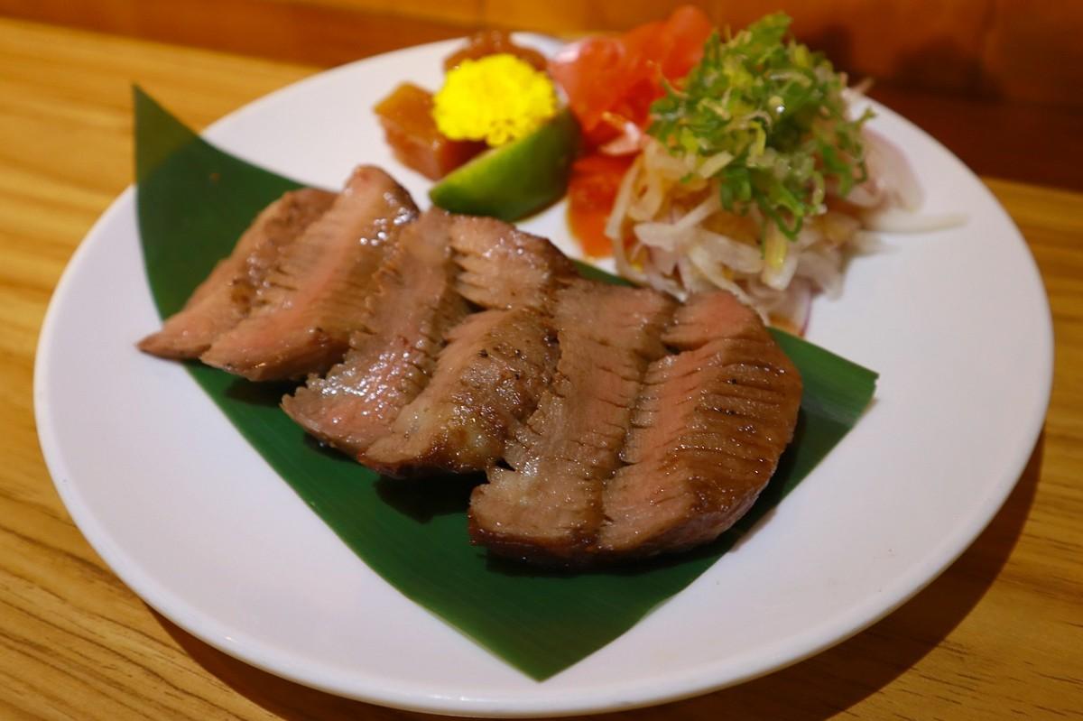 粉嫩多汁的厚切牛舌,搭配鮮紅福神漬、鮮綠青蔥與檸檬