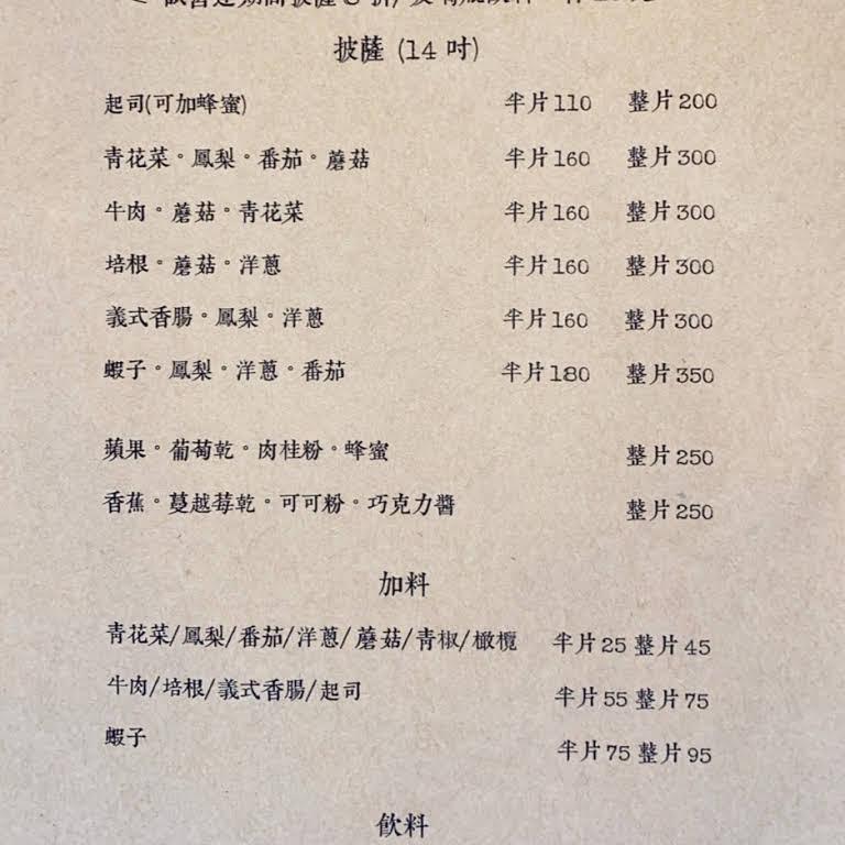 菜單較特別每一個pizza沒有名字,直接把pizza內容物寫在菜單上,價格120~270。今天點的是牛肉、蘑菇、青花菜,pizza餅皮屬於薄片,起司份量足夠,牛肉給的很大方但蘑菇稍乾。店家很貼心的把披薩分半紙盒用一半的方式讓人方便外帶。