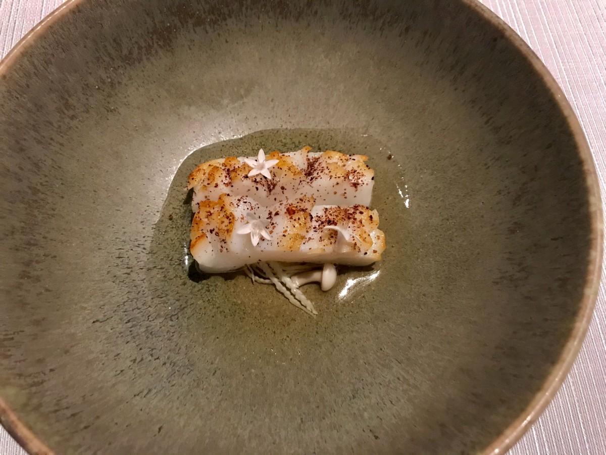 花枝單純地用鐵板嫩煎,表層撒上鹽膚木,底部是半天筍花和美白菇,點綴繁星白花。