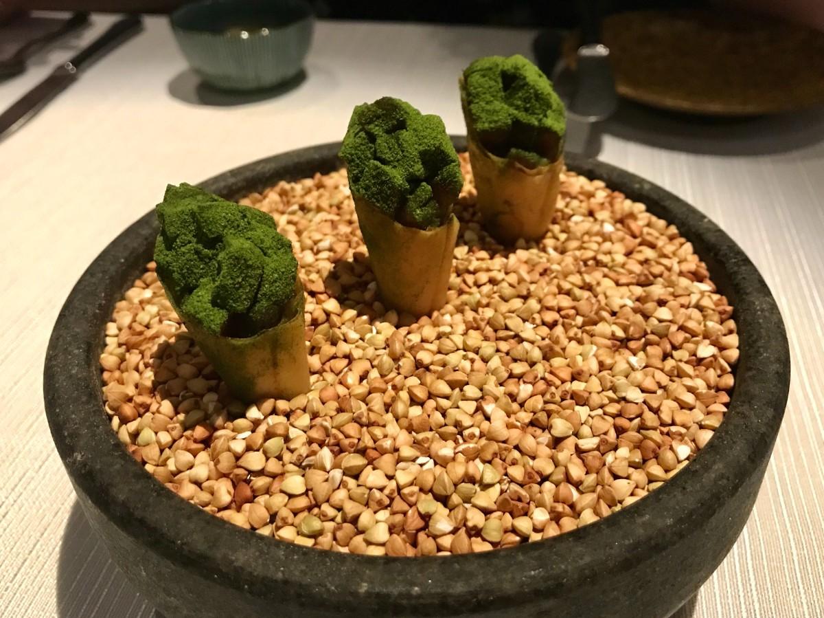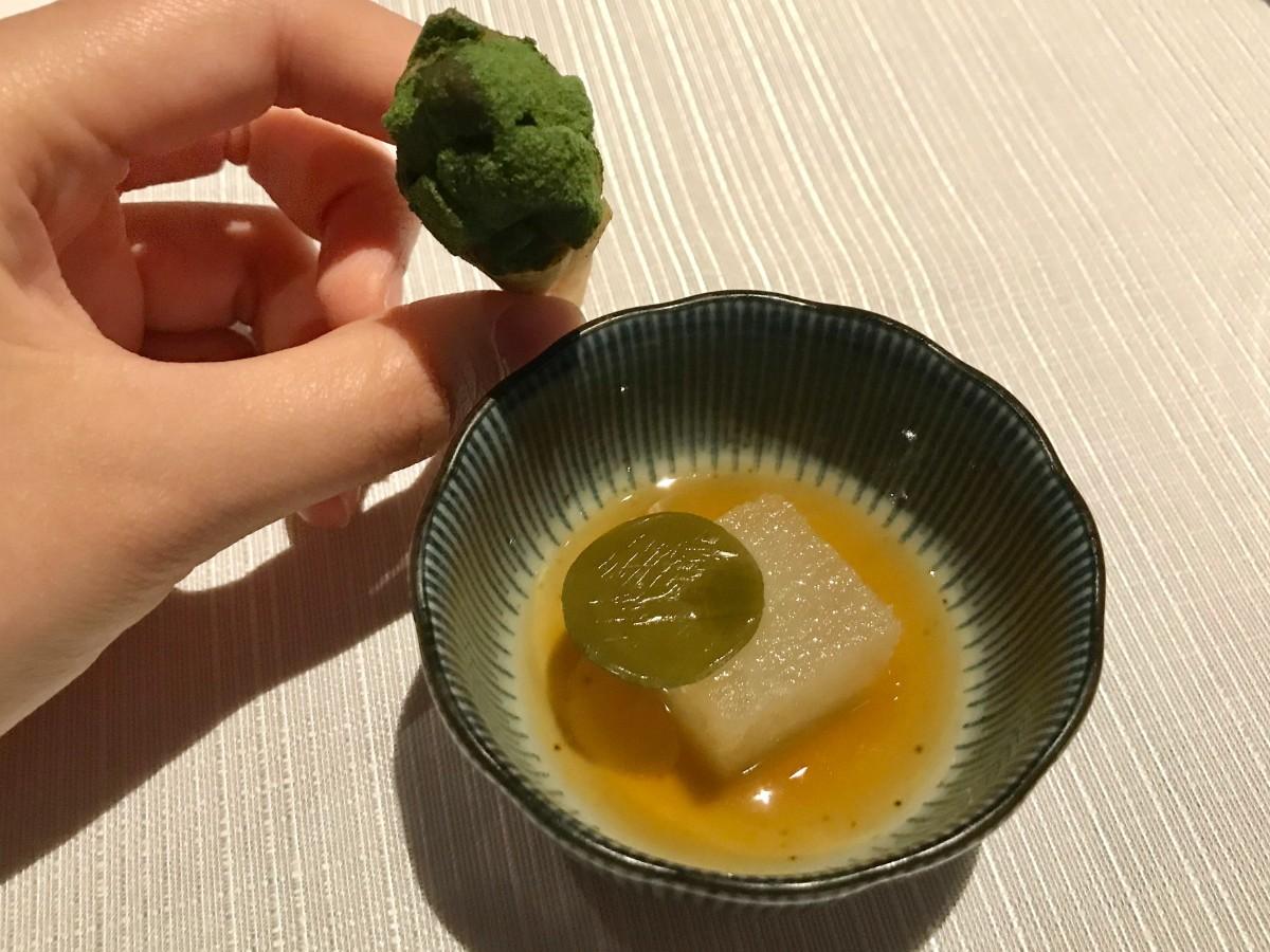 鰹魚的炙燒香氣跟柚子胡椒帶來的一點辛辣感直接喚醒一整天尚未進食的味蕾。而冬瓜烹調的緊緻順口,先是嚐到海帶天然的海藻風味,接著是澄清湯的自然酸度,最後襯托出冬瓜鮮甜的風味。