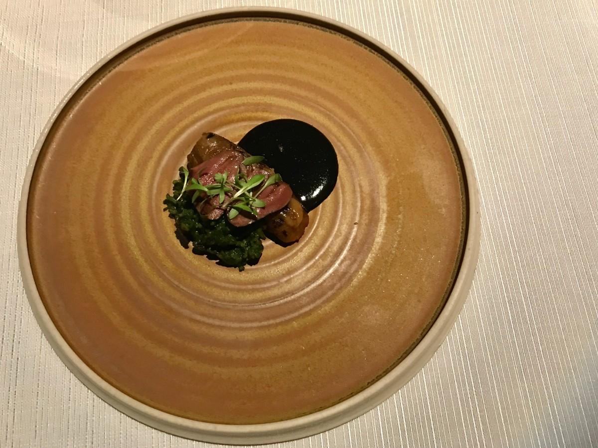 嫩煎鴨心,白味增炭烤茄子,芝麻葉、菠菜葉與加拿大野米,搭配茄子醬汁。