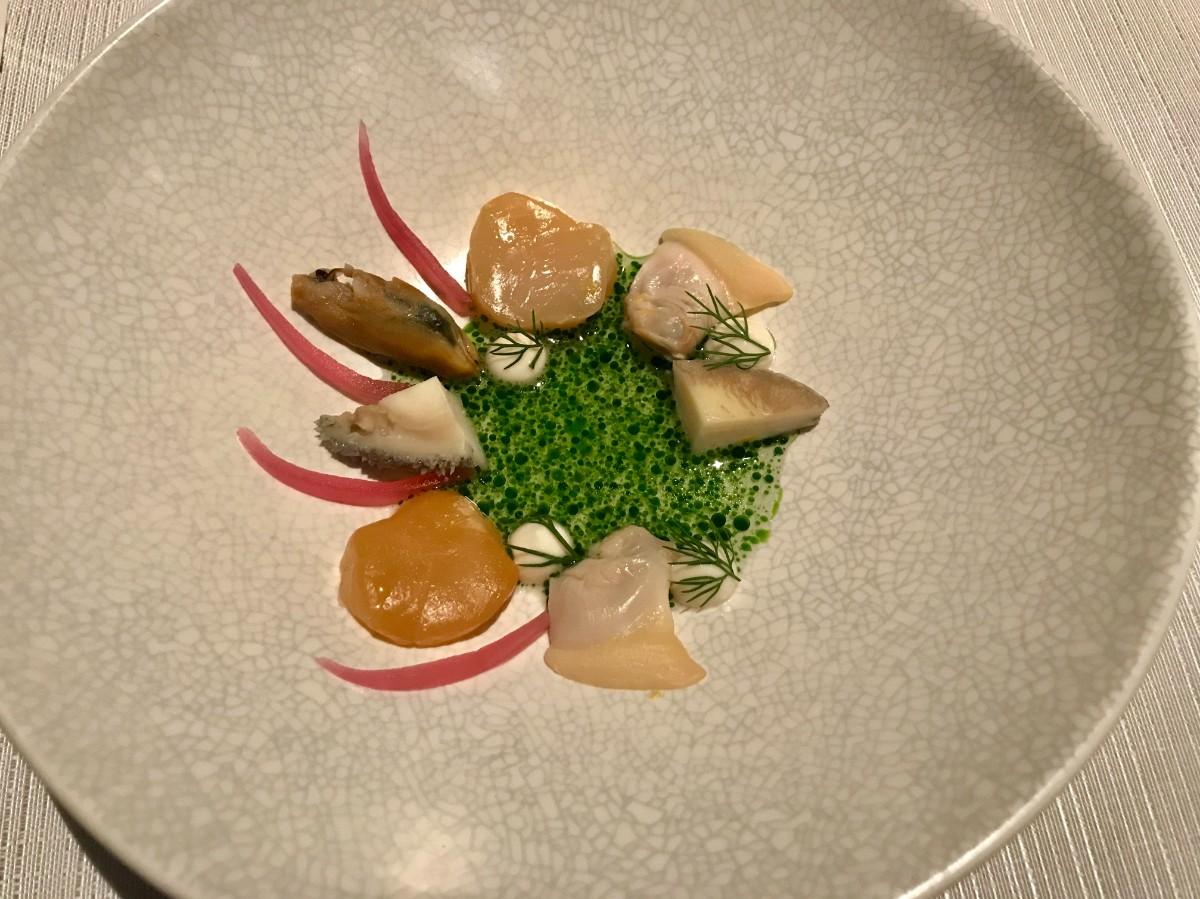 這道用了四種貝類,別是煙燻干貝、蒸煮牛奶蛤、鮑魚、淡菜,底層是絲瓜清湯、蒔蘿油、杏仁牛奶泥。